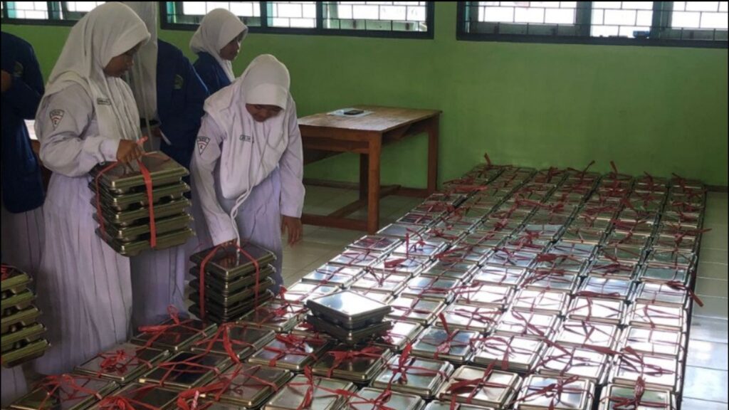 Tak berhenti di situ, hari ini juga menjadi momen perdana pelaksanaan Program Makan Bergizi Gratis (MBG) di MTsN 3 Nganjuk. Para siswa tampak antusias menikmati hidangan sehat yang disiapkan, lengkap dengan menu bergizi seimbang yang terdiri dari karbohidrat, protein, sayuran, dan buah.